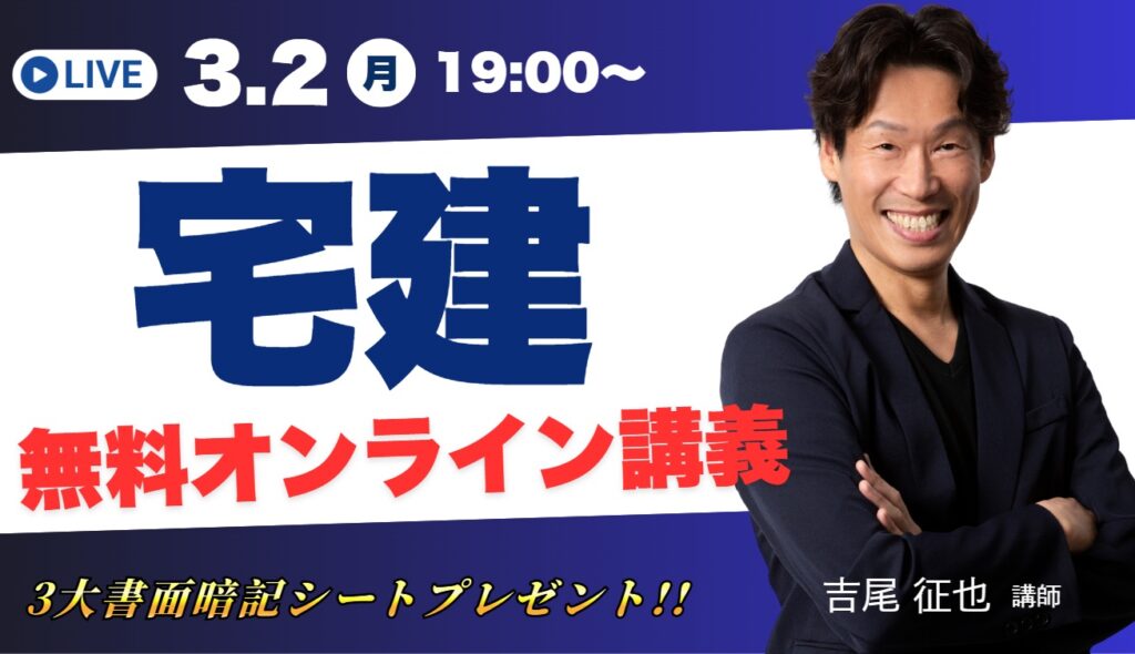 オリジナルを含む3,000問以上の問題、合格に必要なテキストや動画を完全無料で利用できる「宅スマ」が、 カリスマ講師「吉尾征也」氏を招いて、勉強嫌いでも分かる無料オンライン講義を開催いたします。 ■ 講義日程 2026年3月2日(月) 19:00〜(90分予定) ... -