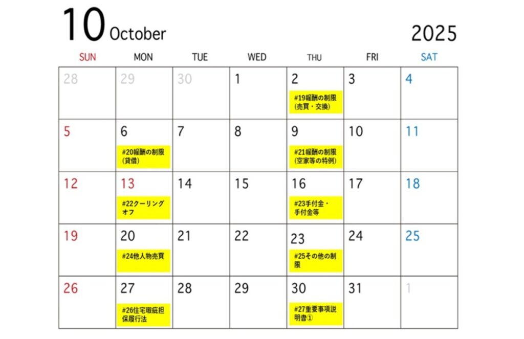 10月の動画スケジュールを公開致しました。毎週月・木の2回動画を更新していきます。宅建講師の「吉尾征也」先生の神講義で宅建試験の合格を勝ち取りましょう!!